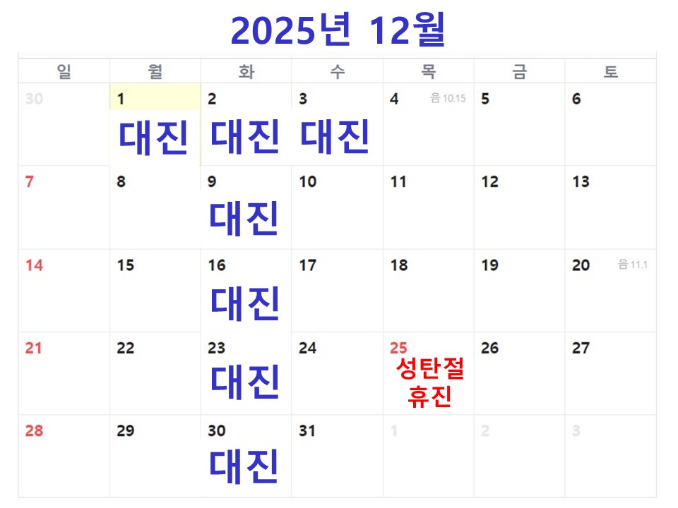 * 2025³â 12¿ù 1ÀÏ(¿ù)~12¿ù 3ÀÏ(¼ö) À̺ñÀÎÈİú Àü¹®ÀÇ ´ëÁøÇÕ´Ï´Ù.