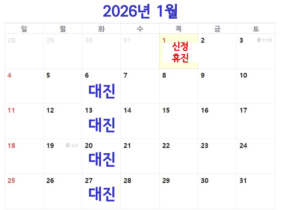* 2026³â 1¿ù 1ÀÏ(¸ñ) ½ÅÁ¤ ÈÞÁøÇÕ´Ï´Ù.